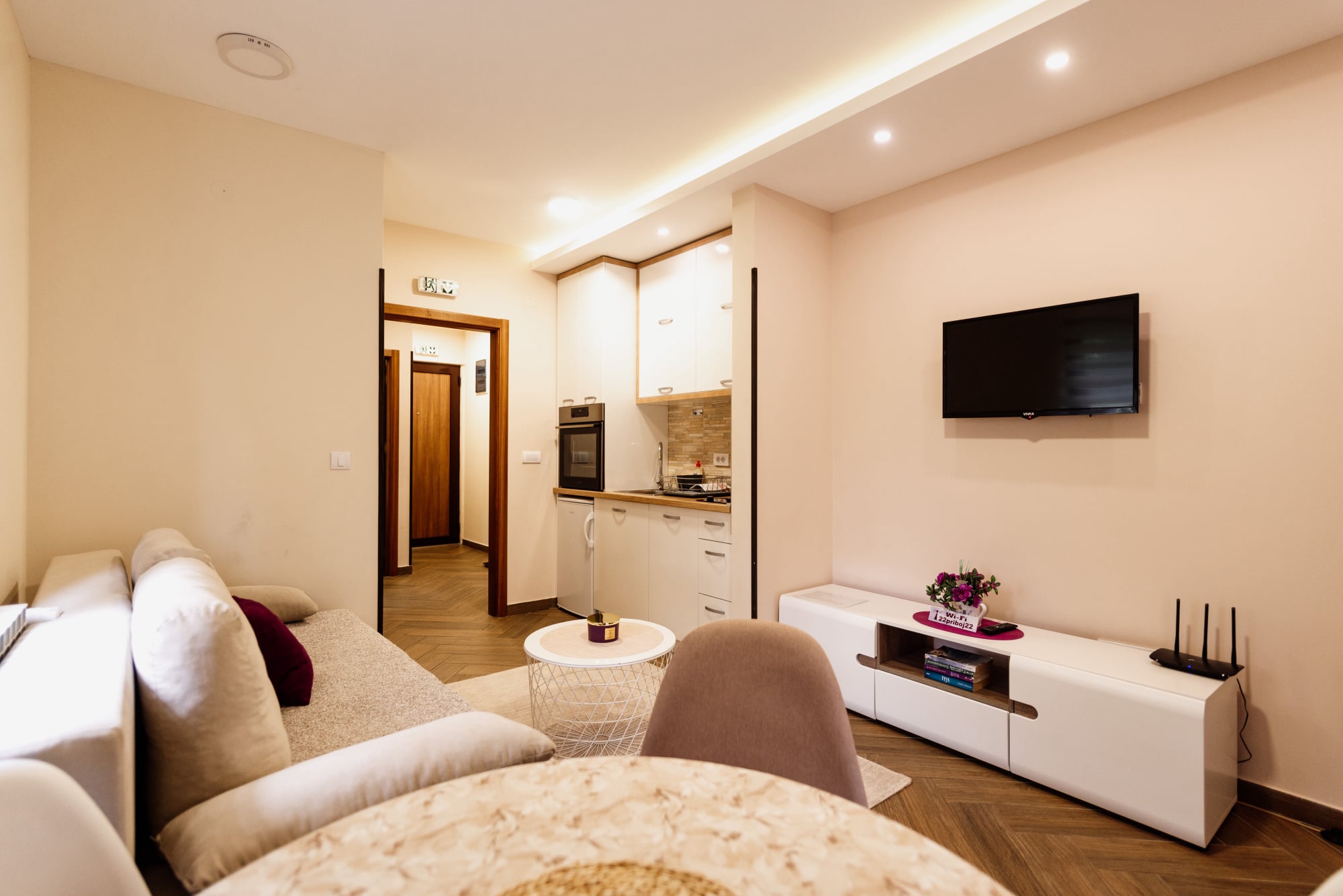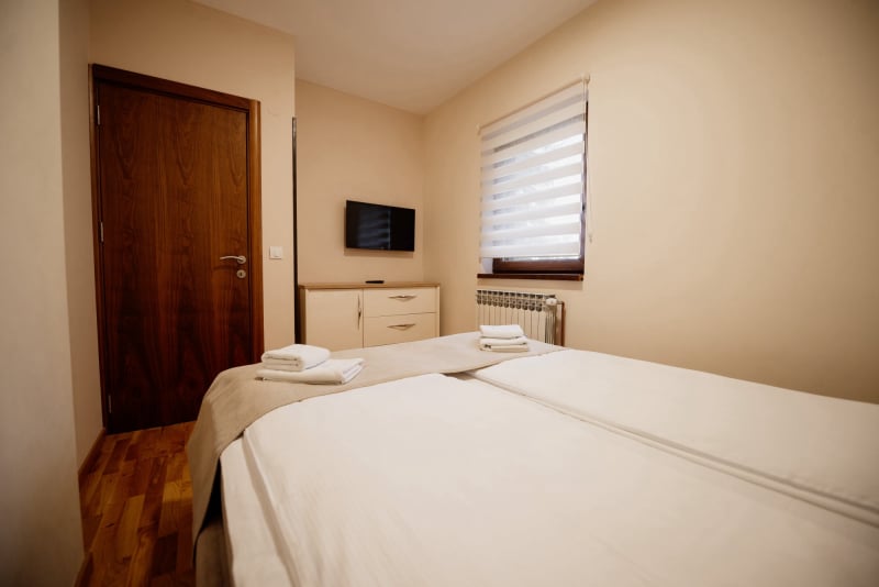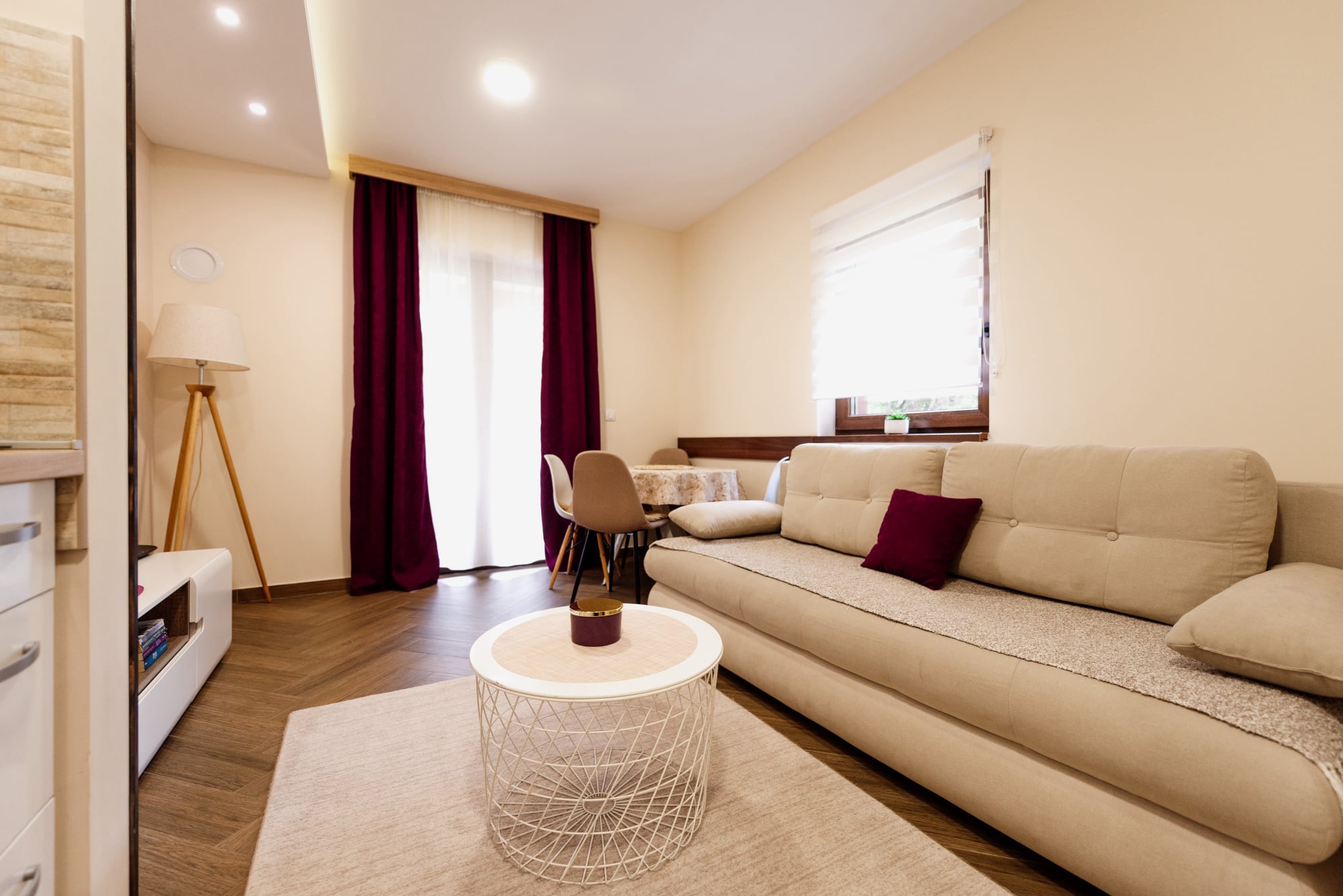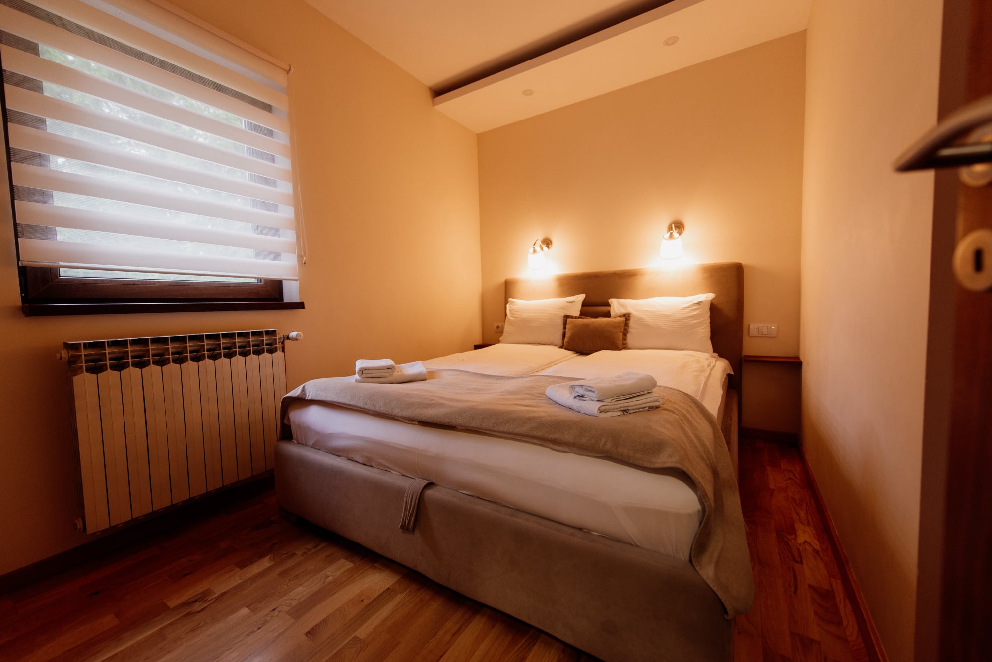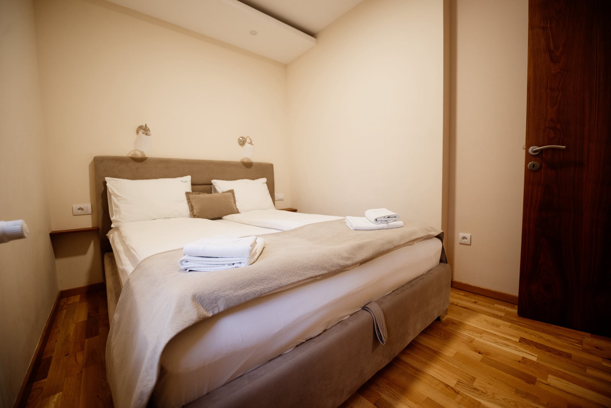 APARTMAN 2 - Predsoblje, spavaća soba sa francuskim ležajem, dnevna soba sa ugaonom garniturom, kuhinja sa kompletnim posuđem, terasa sa stolom i stolicama, WC-toalet sa tuš kabinom. Svi apartmani imaju centralno i podno grejanje, LED TV u spavaćoj i dnevnoj sobi, WiFi sa PET pristupih tačaka, SEF za lične stvari. Površina 45 kvm + 8 kvm terasa.