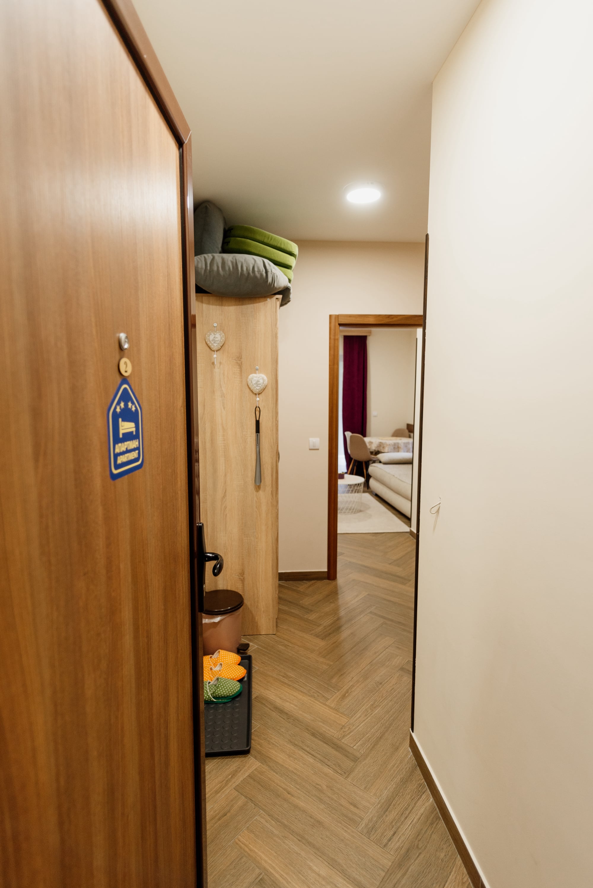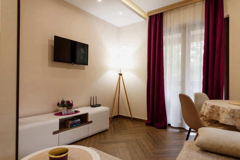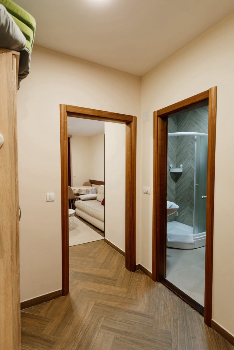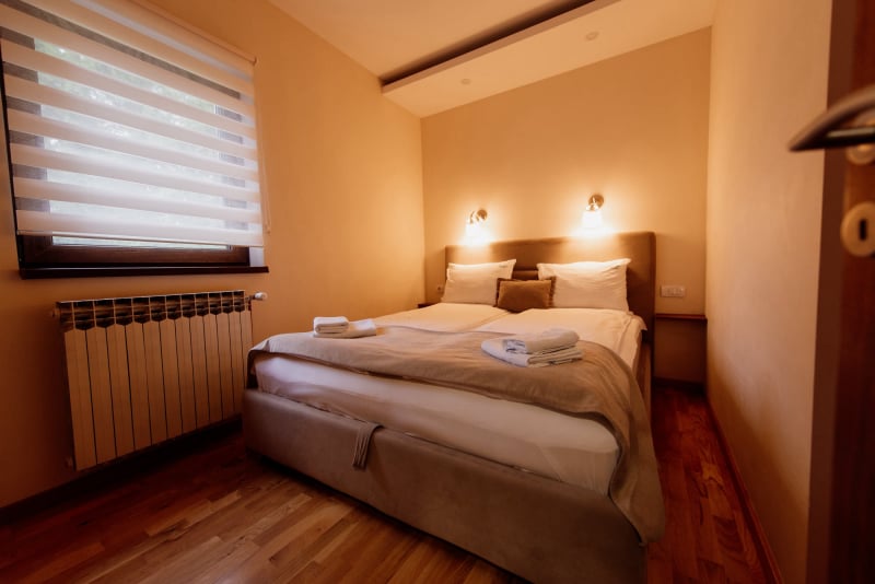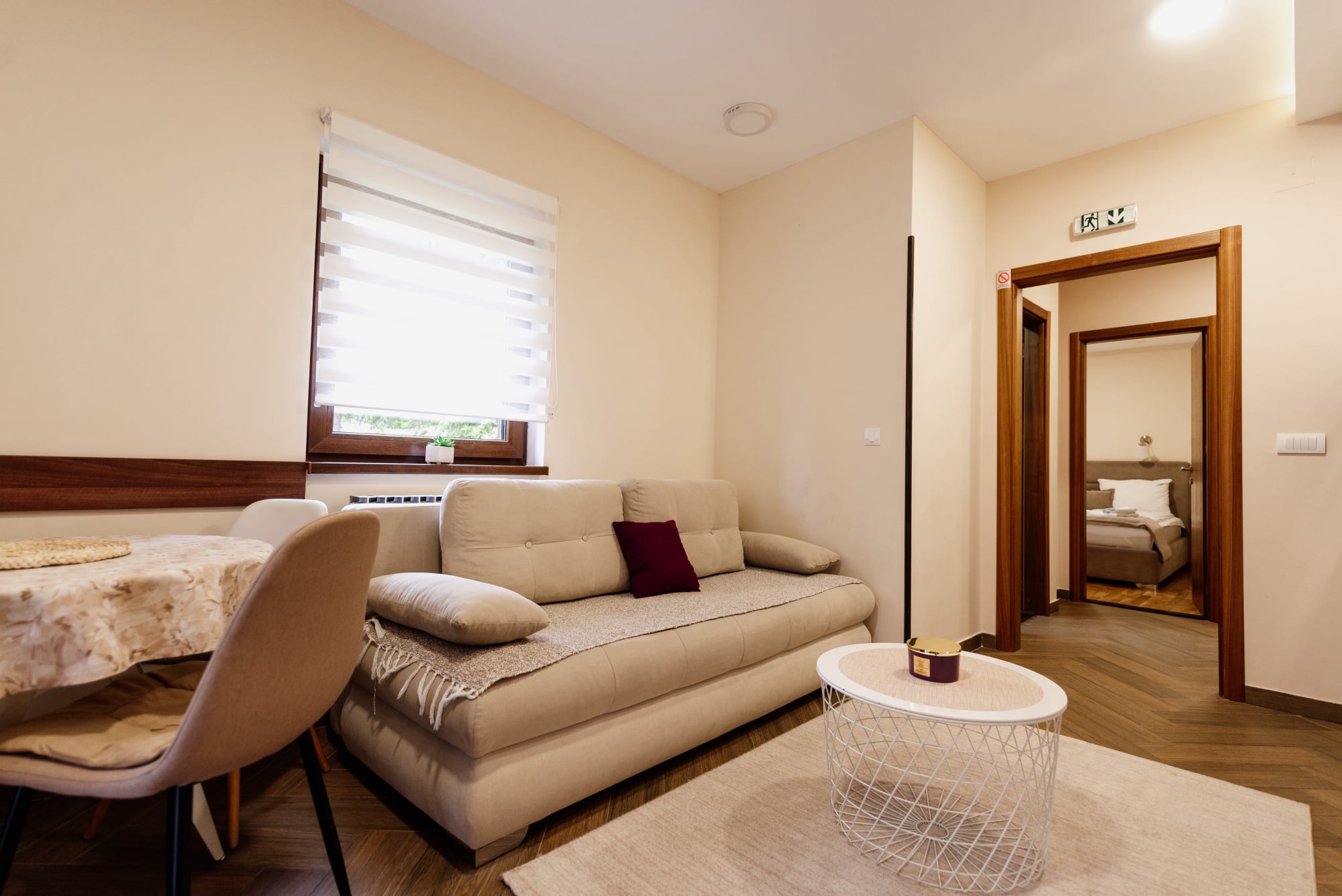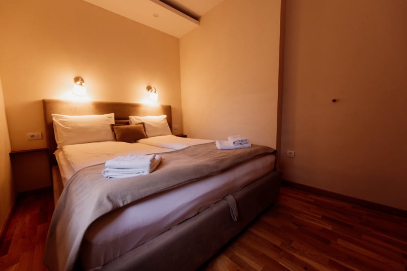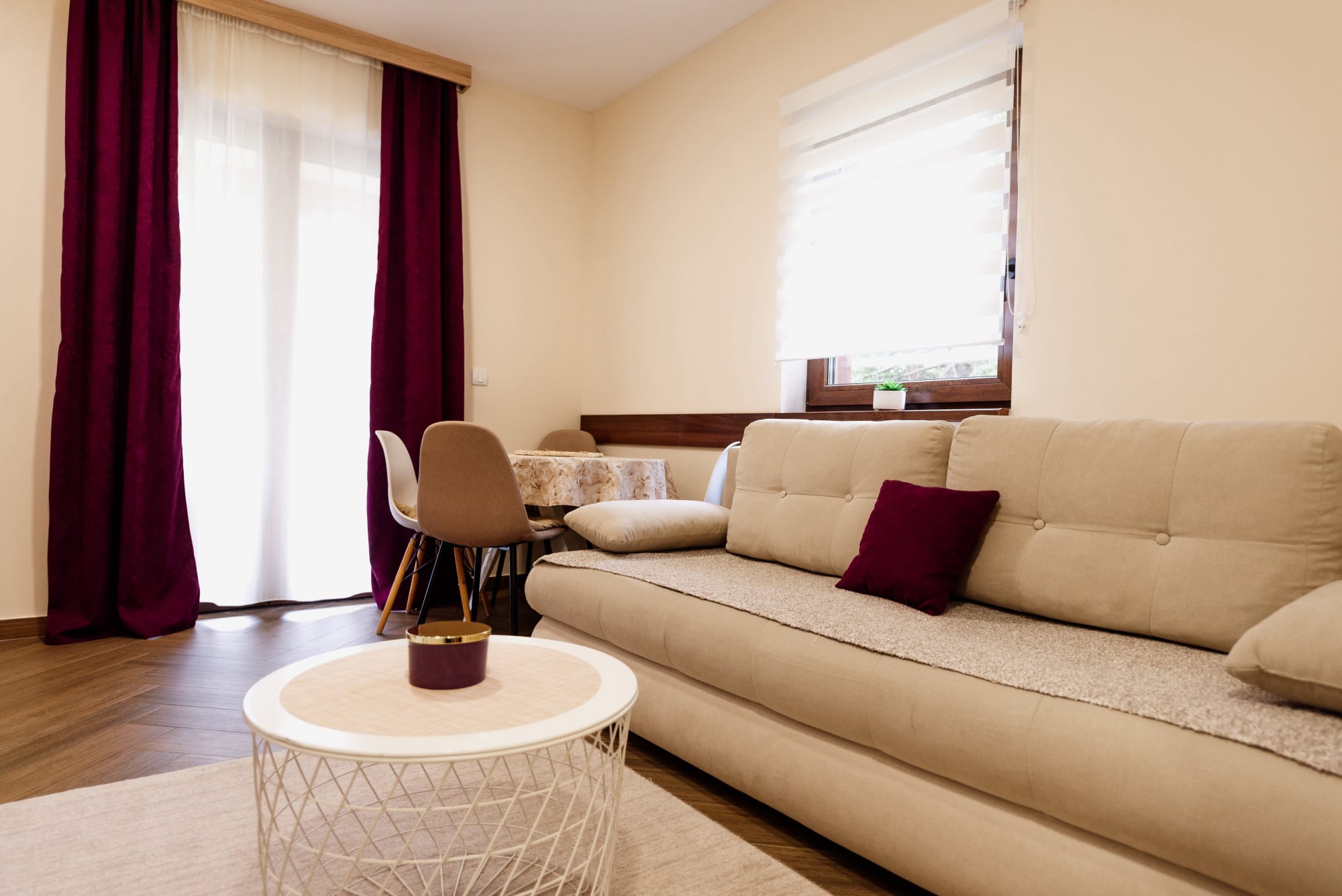APARTMAN 2 - Predsoblje, spavaća soba sa francuskim ležajem, dnevna soba sa ugaonom garniturom, kuhinja sa kompletnim posuđem, terasa sa stolom i stolicama, WC-toalet sa tuš kabinom. Svi apartmani imaju centralno i podno grejanje, LED TV u spavaćoj i dnevnoj sobi, WiFi sa PET pristupih tačaka, SEF za lične stvari. Površina 45 kvm + 8 kvm terasa.