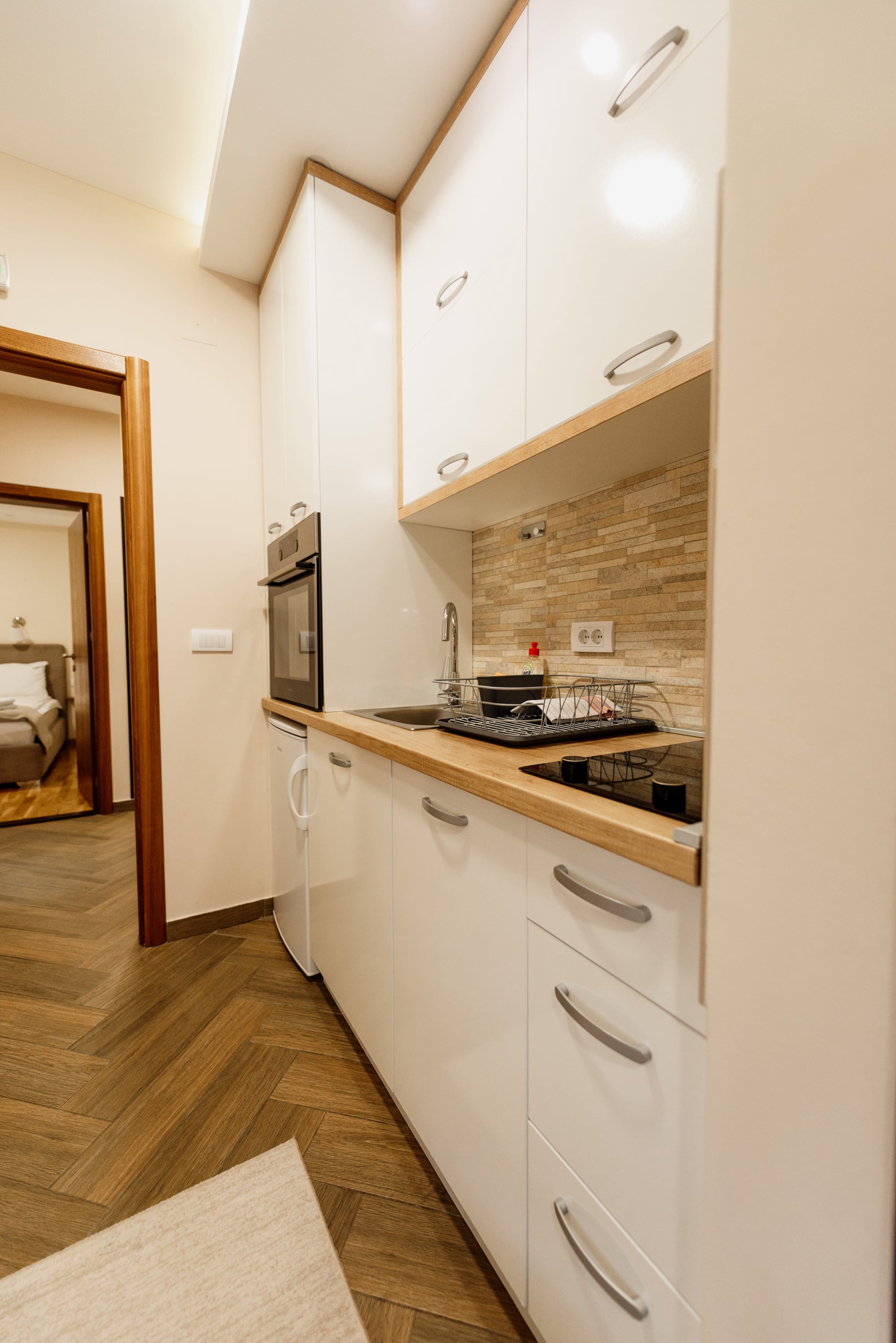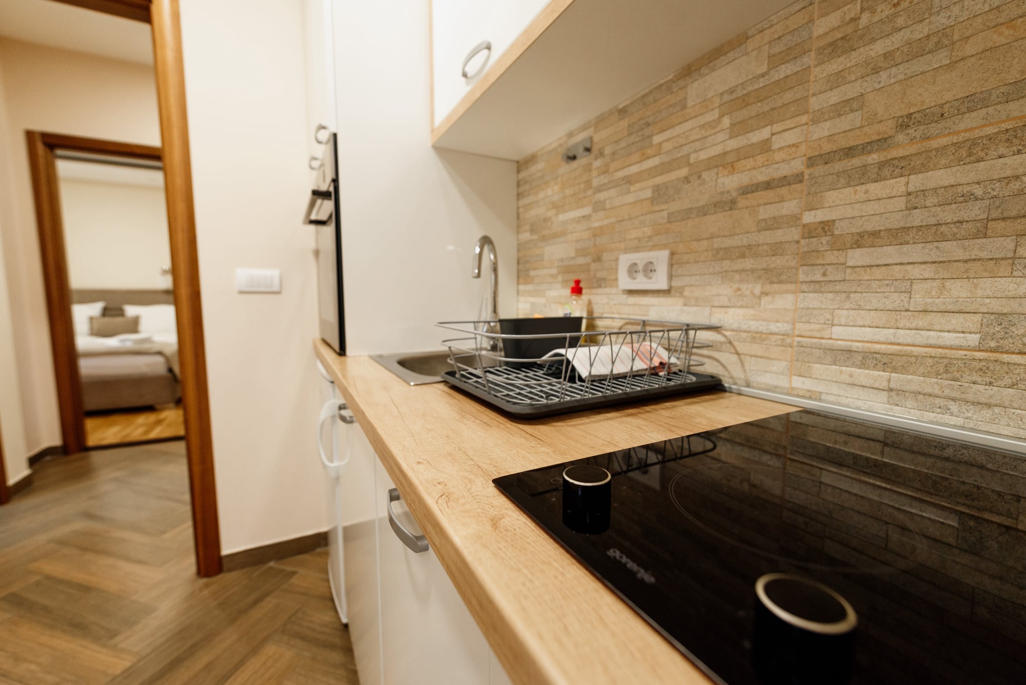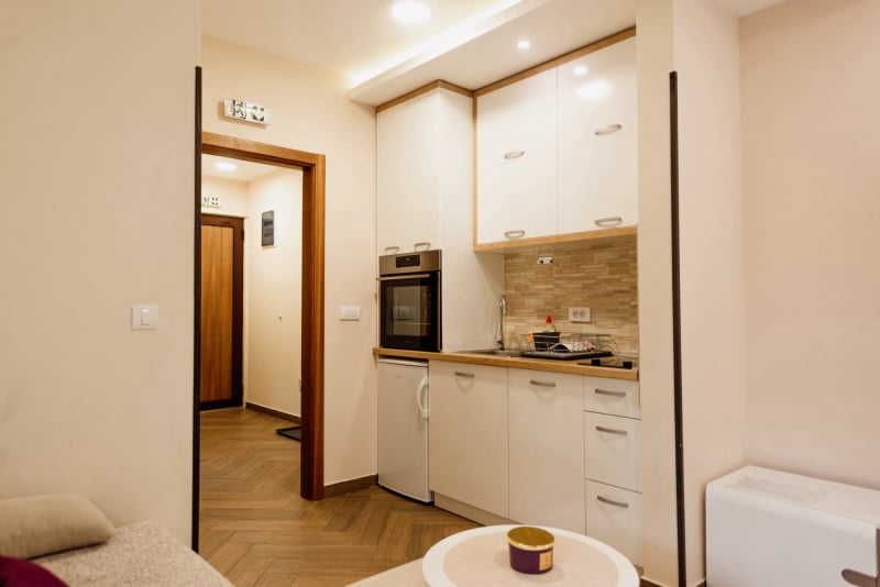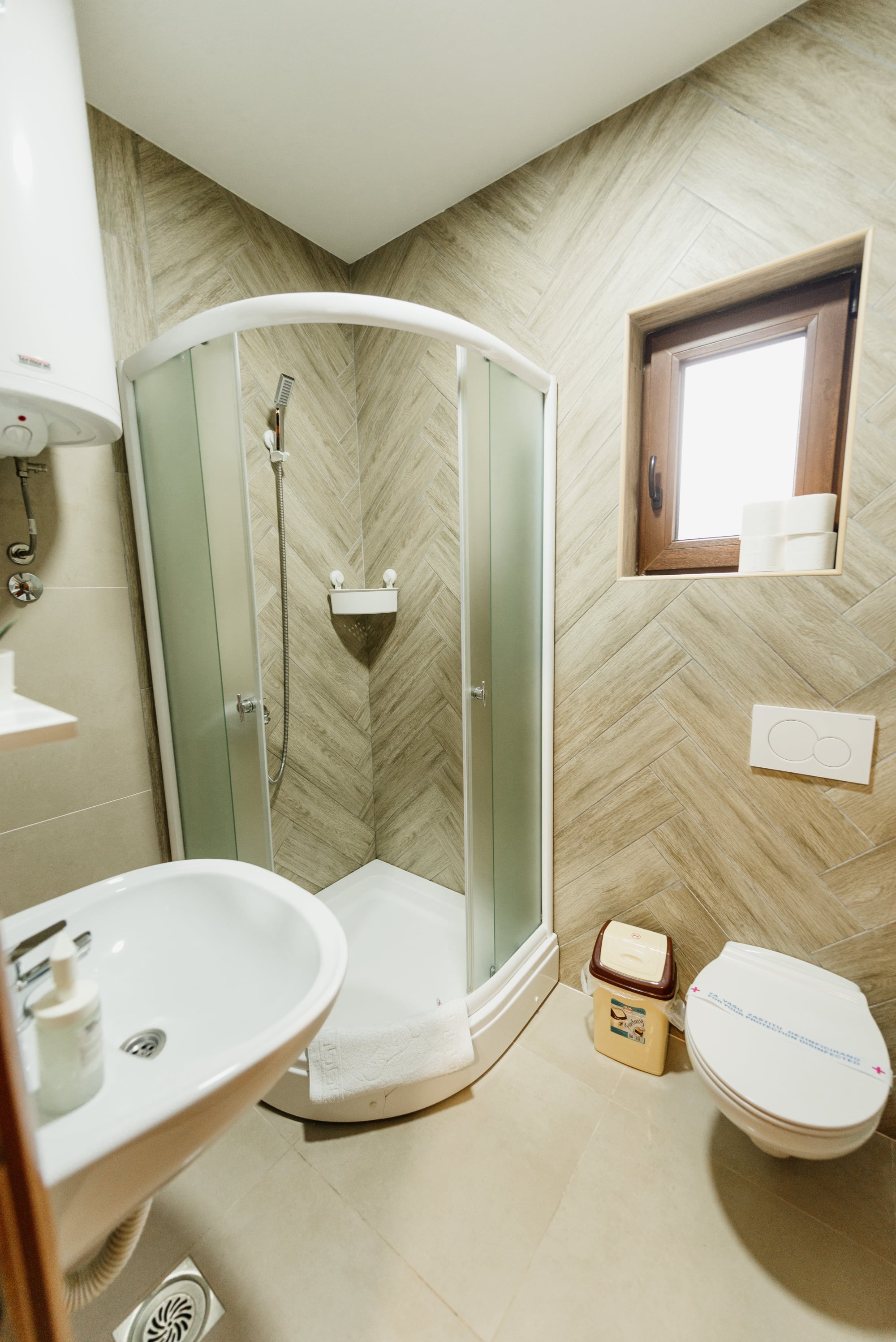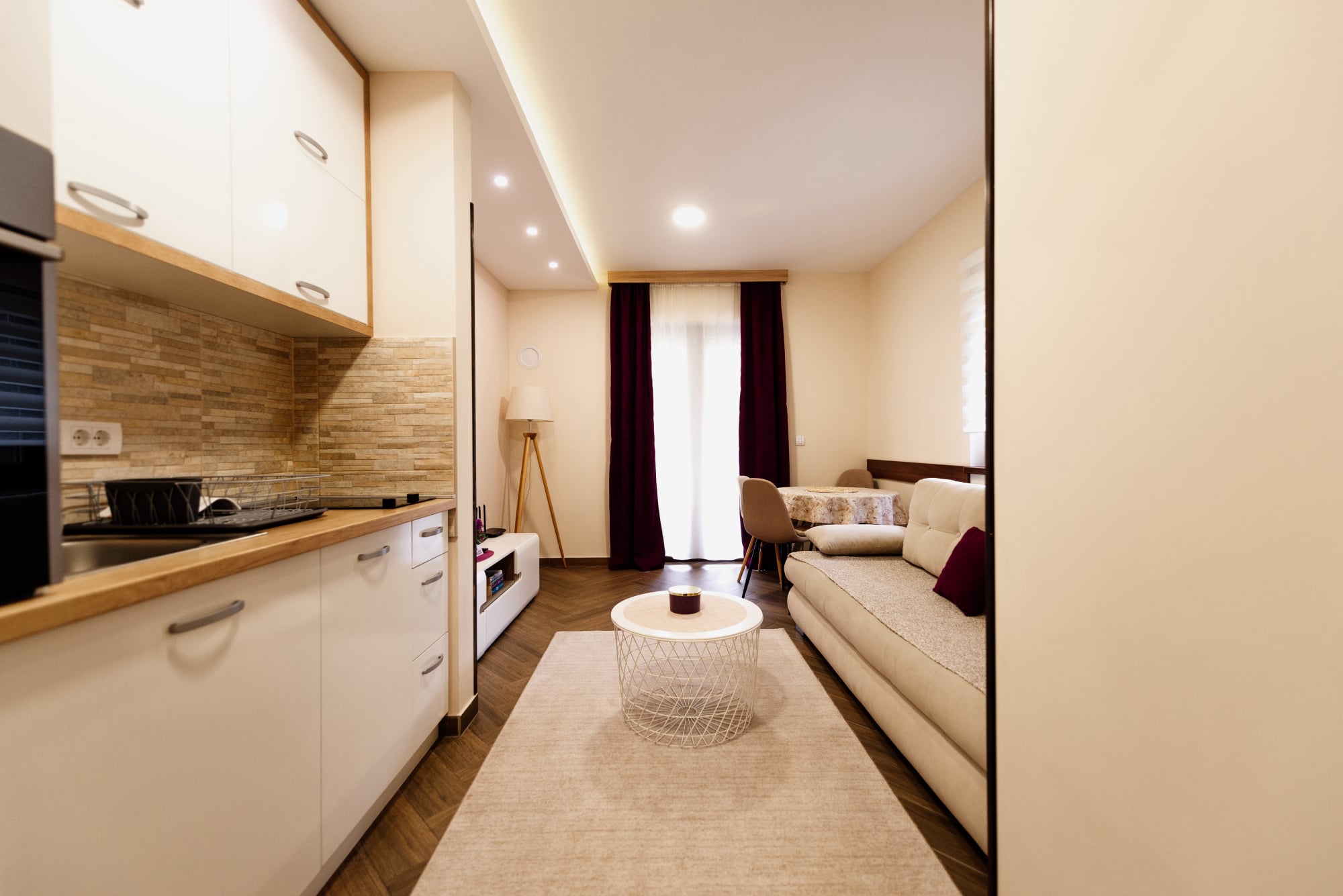 APARTMAN 2 - Predsoblje, spavaća soba sa francuskim ležajem, dnevna soba sa ugaonom garniturom, kuhinja sa kompletnim posuđem, terasa sa stolom i stolicama, WC-toalet sa tuš kabinom. Svi apartmani imaju centralno i podno grejanje, LED TV u spavaćoj i dnevnoj sobi, WiFi sa PET pristupih tačaka, SEF za lične stvari. Površina 45 kvm + 8 kvm terasa.