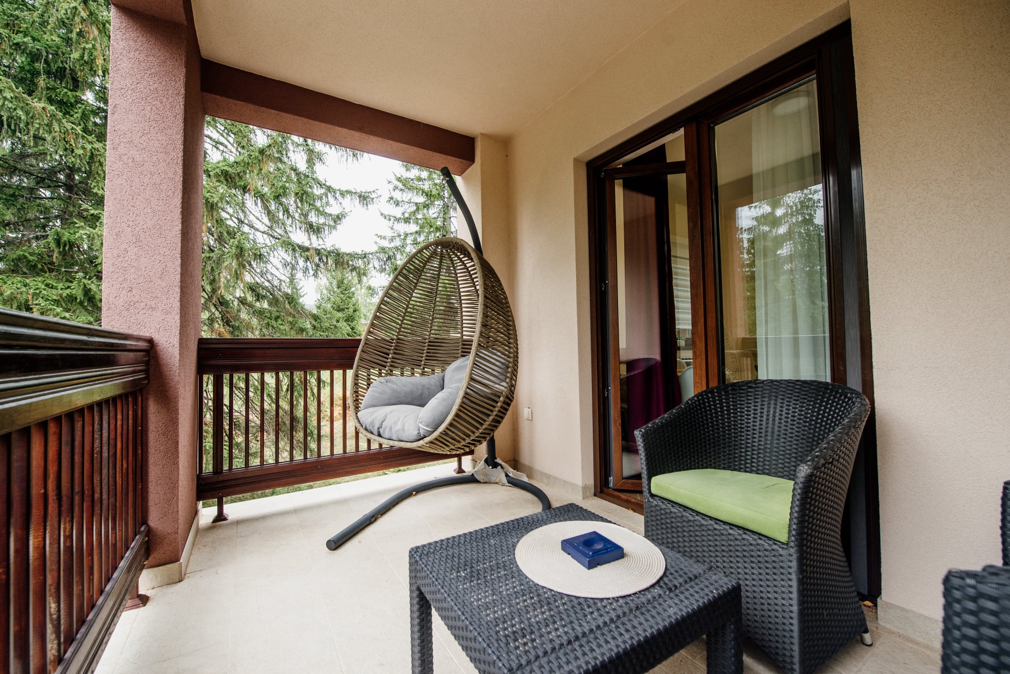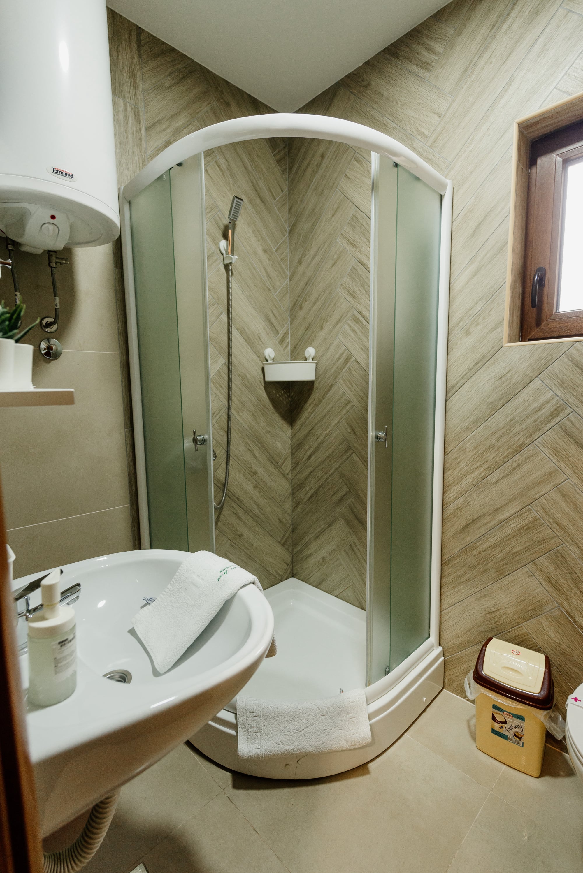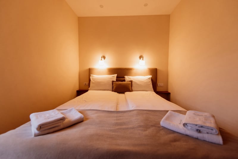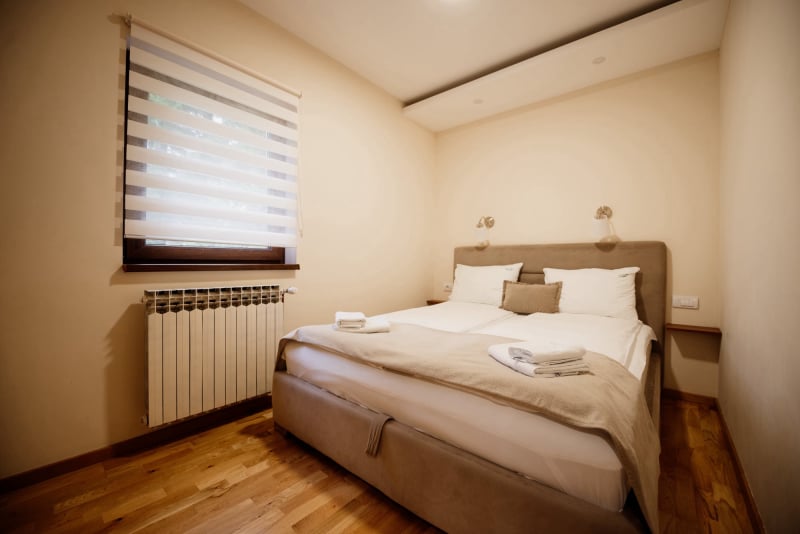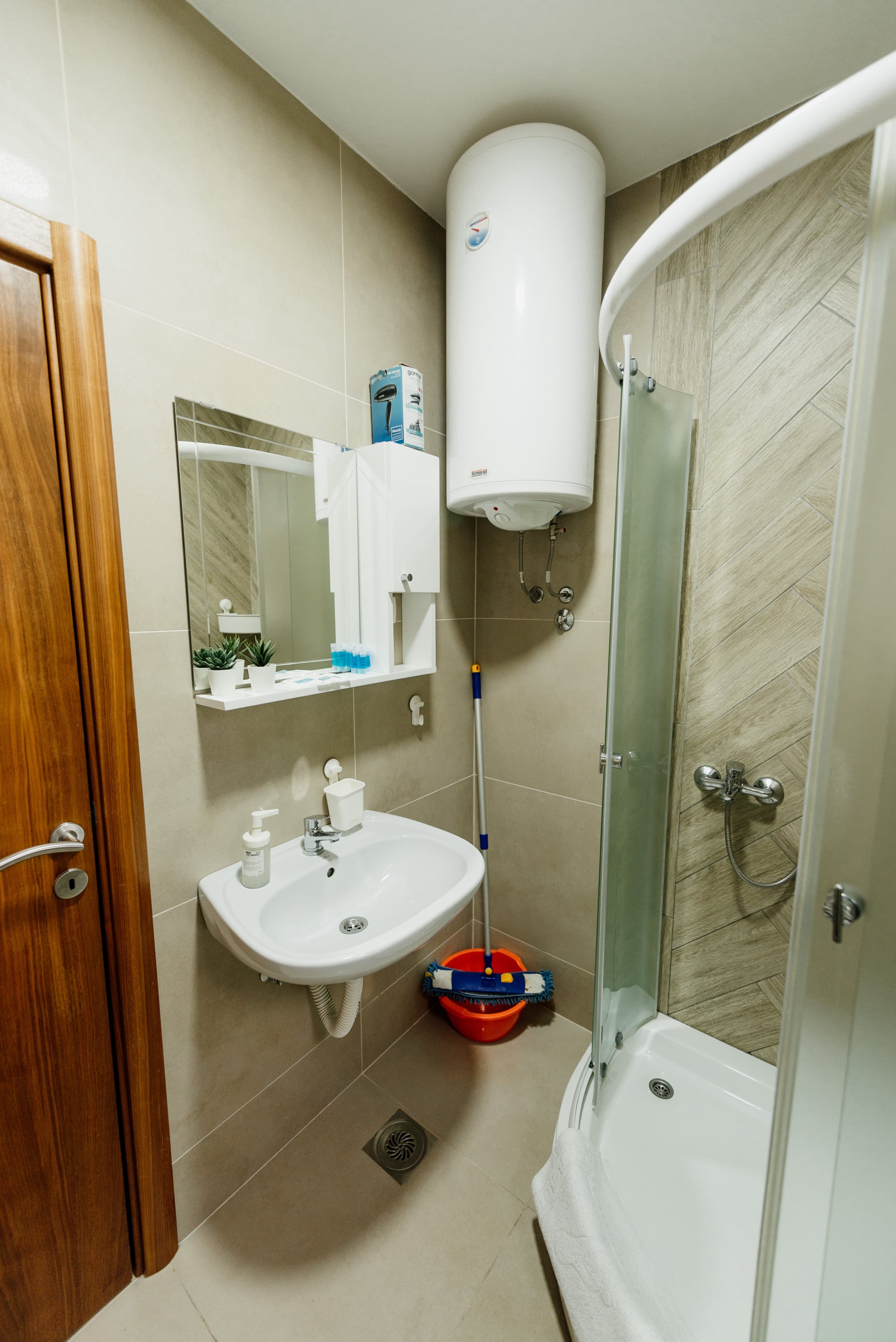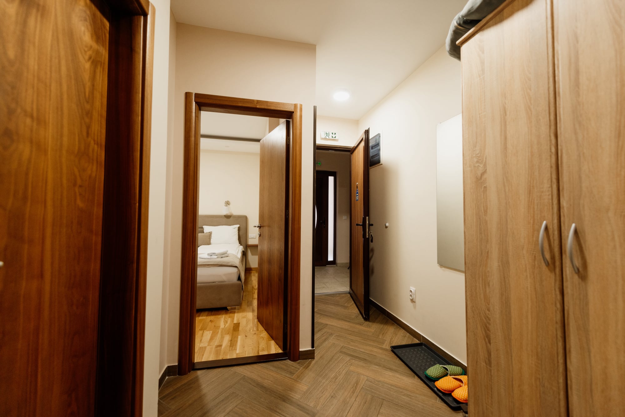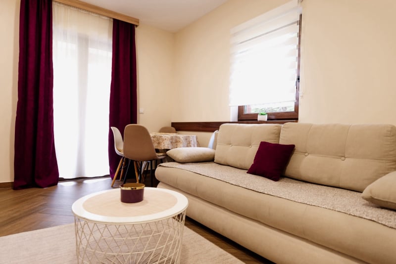APARTMAN 2 - Predsoblje, spavaća soba sa francuskim ležajem, dnevna soba sa ugaonom garniturom, kuhinja sa kompletnim posuđem, terasa sa stolom i stolicama, WC-toalet sa tuš kabinom. Svi apartmani imaju centralno i podno grejanje, LED TV u spavaćoj i dnevnoj sobi, WiFi sa PET pristupih tačaka, SEF za lične stvari. Površina 45 kvm + 8 kvm terasa.