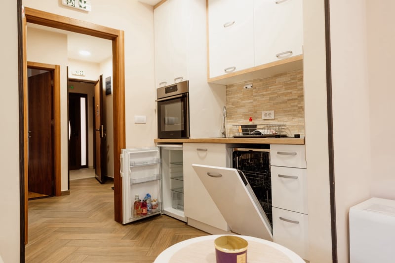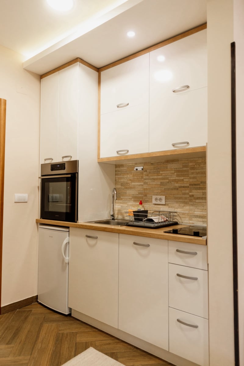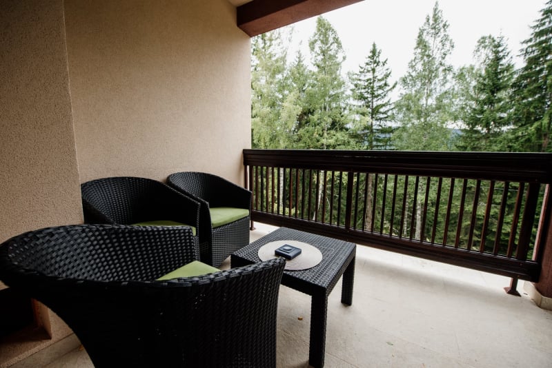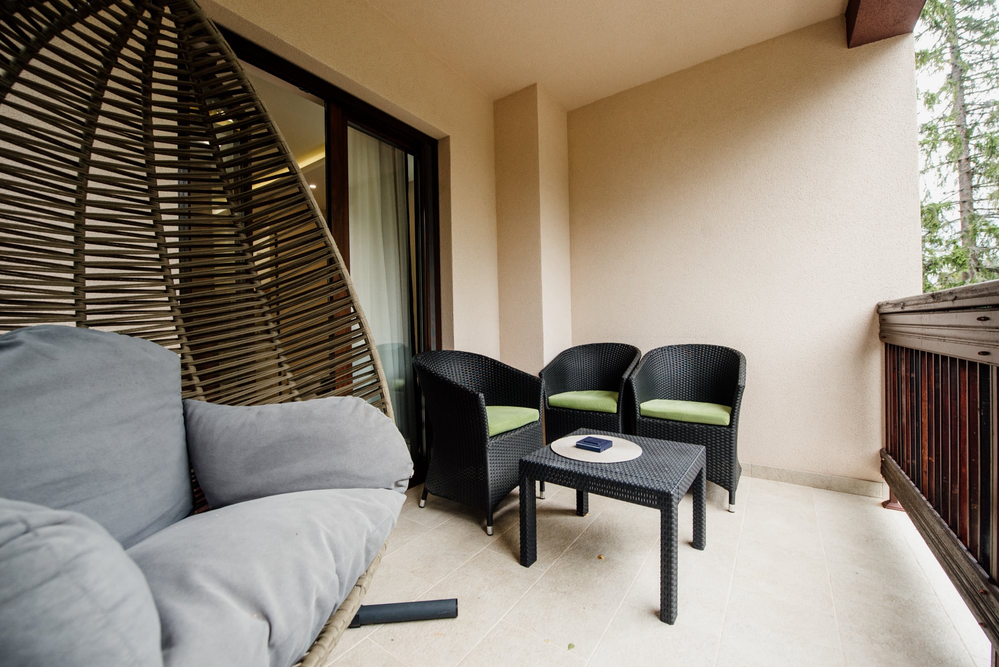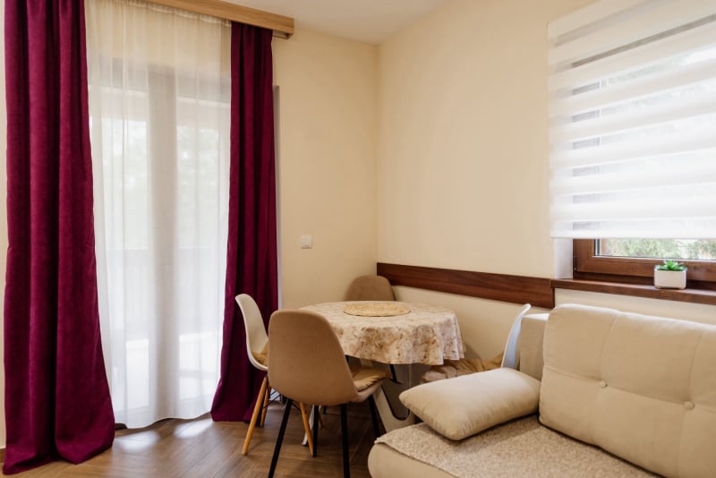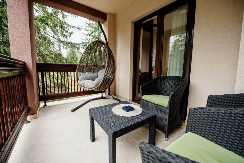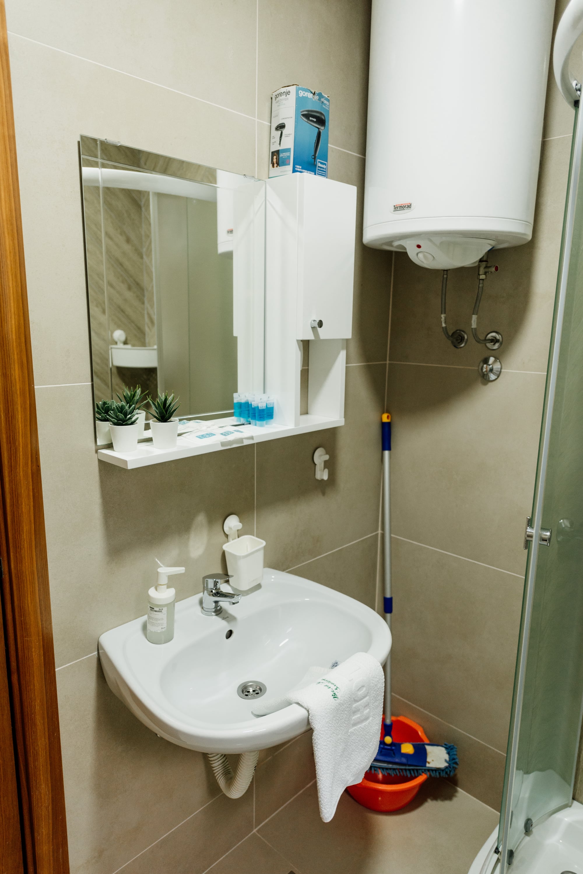 APARTMAN 2 - Predsoblje, spavaća soba sa francuskim ležajem, dnevna soba sa ugaonom garniturom, kuhinja sa kompletnim posuđem, terasa sa stolom i stolicama, WC-toalet sa tuš kabinom. Svi apartmani imaju centralno i podno grejanje, LED TV u spavaćoj i dnevnoj sobi, WiFi sa PET pristupih tačaka, SEF za lične stvari. Površina 45 kvm + 8 kvm terasa.
