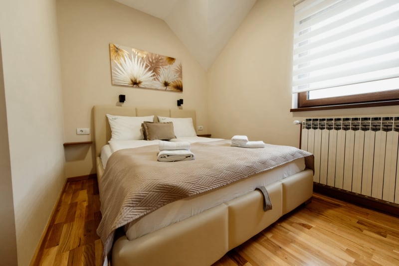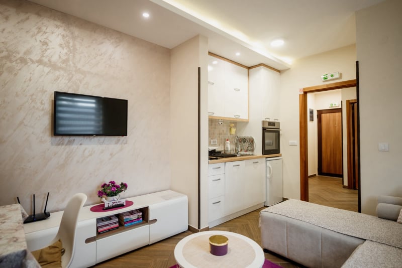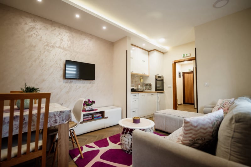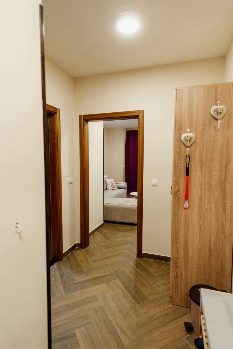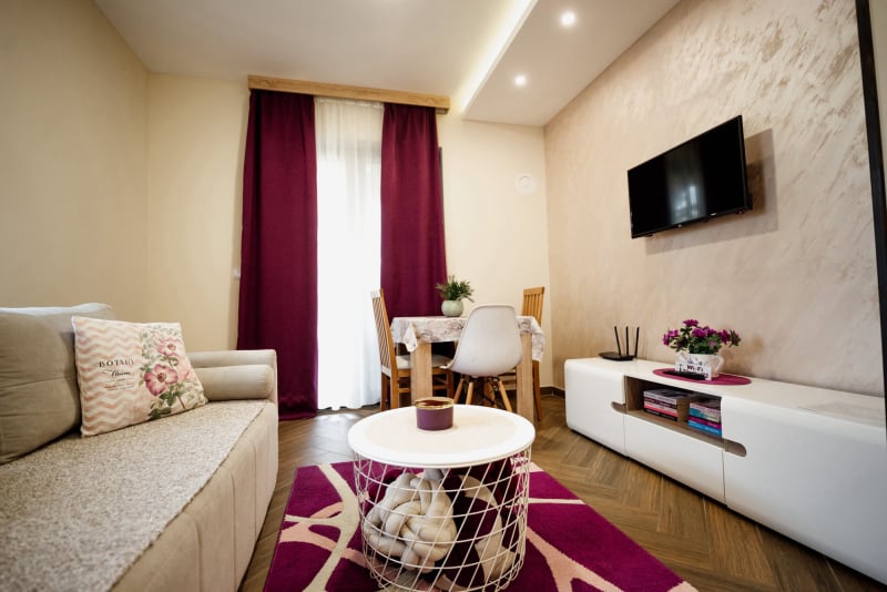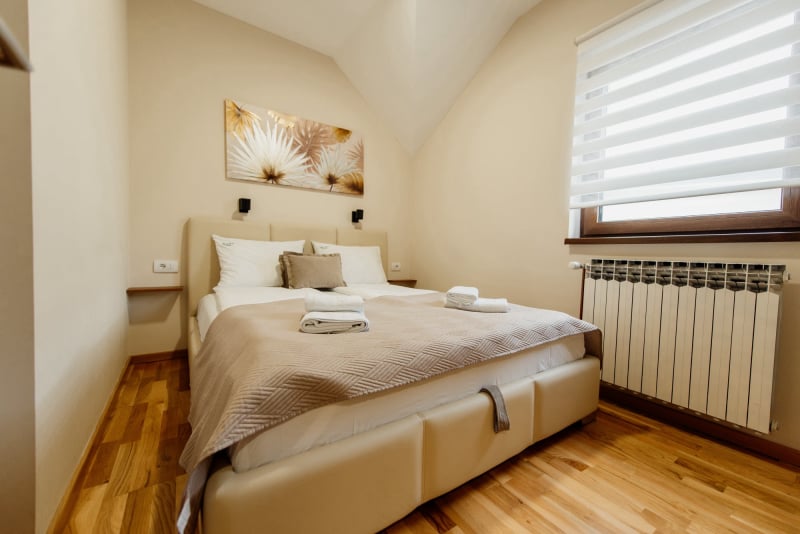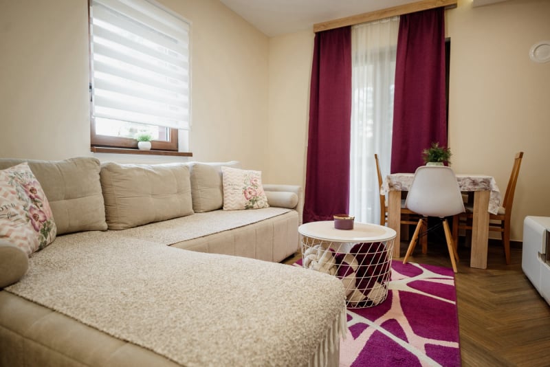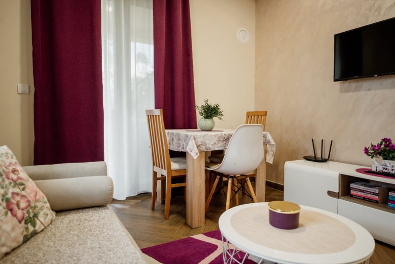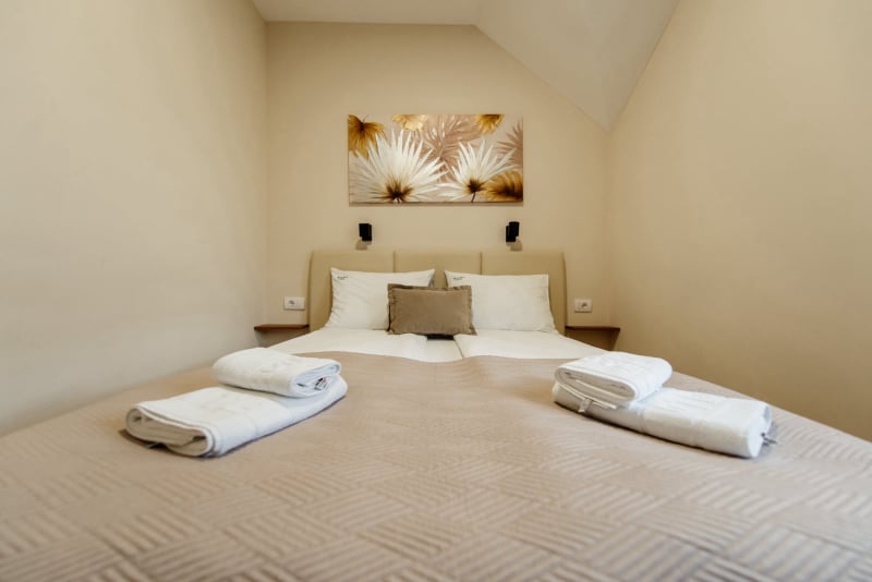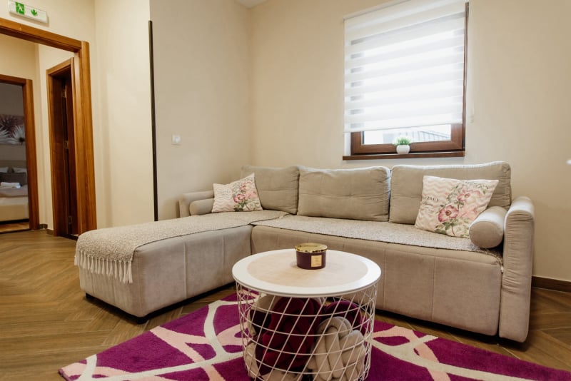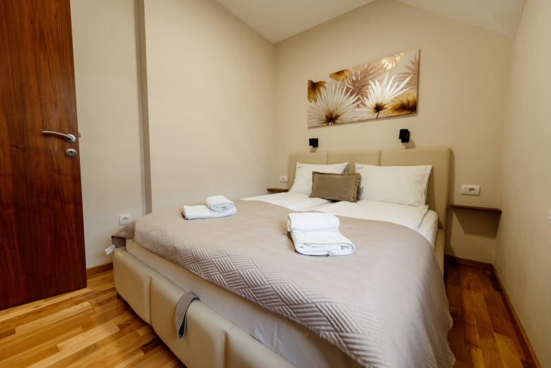 APARTMAN 3 - Predsoblje, spavaća soba sa francuskim ležajem, dnevna soba sa ugaonom garniturom, kuhinja sa kompletnim posuđem, terasa sa stolom i stolicama, WC-toalet sa tuš kabinom. Svi apartmani imaju centralno i podno grejanje, LED TV u spavaćoj i dnevnoj sobi, WiFi sa PET pristupih tačaka, SEF za lične stvari. Površina 45 kvm + 8 kvm terasa.