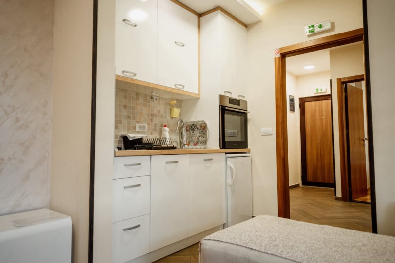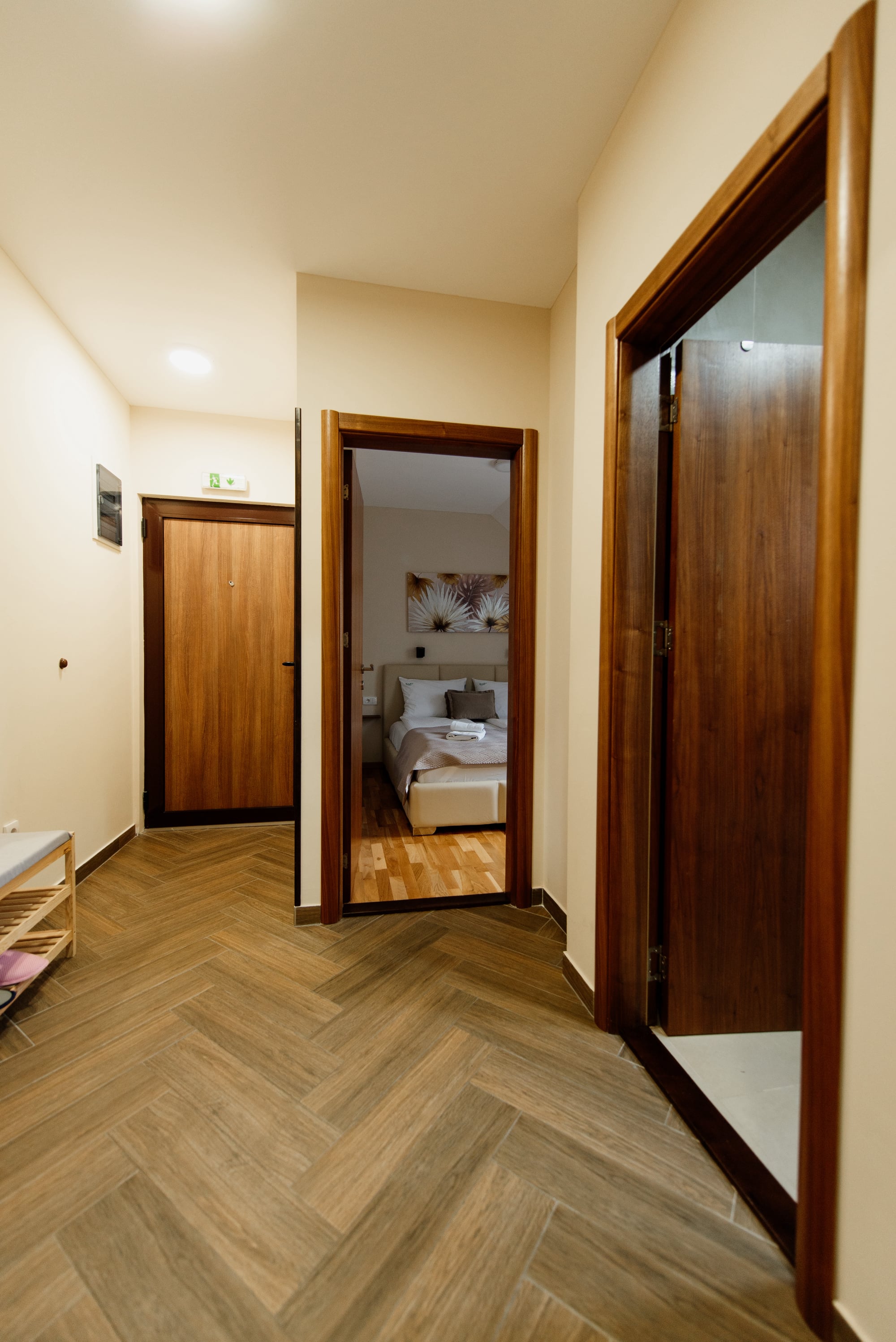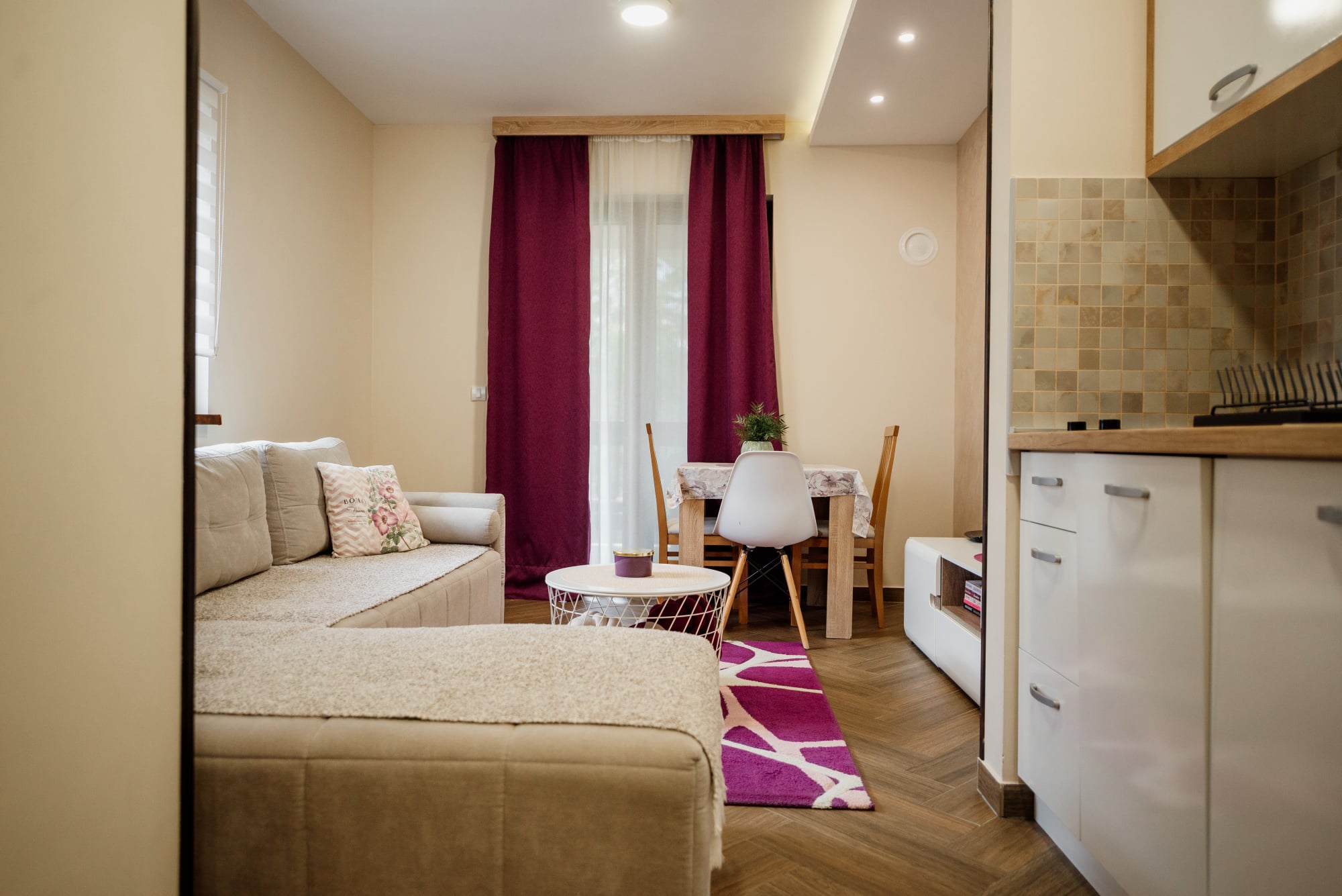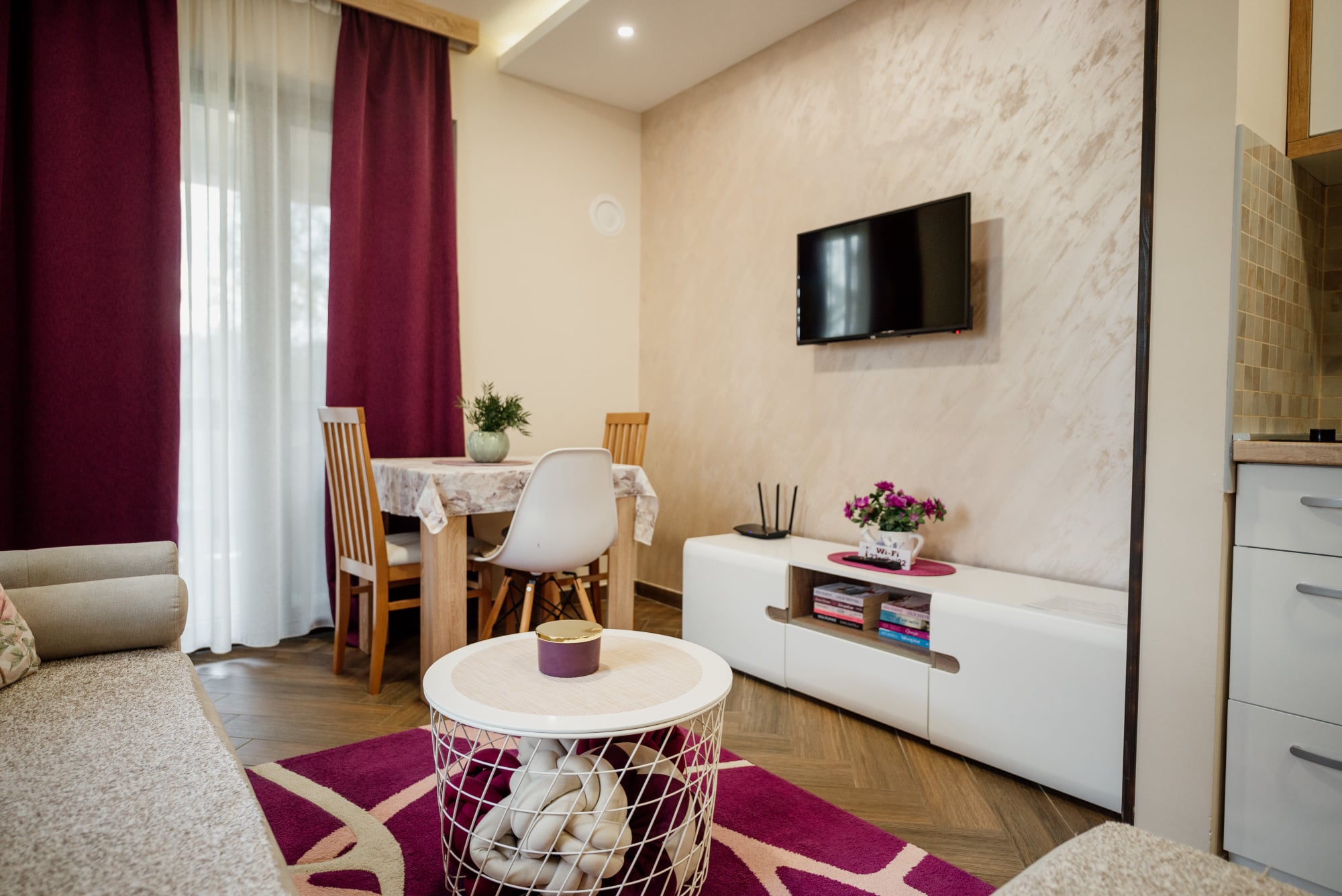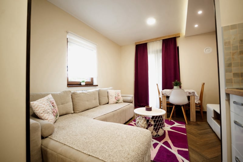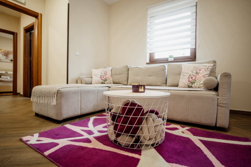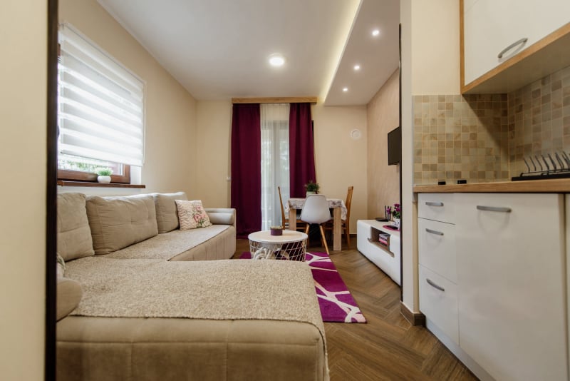APARTMAN 3 - Predsoblje, spavaća soba sa francuskim ležajem, dnevna soba sa ugaonom garniturom, kuhinja sa kompletnim posuđem, terasa sa stolom i stolicama, WC-toalet sa tuš kabinom. Svi apartmani imaju centralno i podno grejanje, LED TV u spavaćoj i dnevnoj sobi, WiFi sa PET pristupih tačaka, SEF za lične stvari. Površina 45 kvm + 8 kvm terasa.