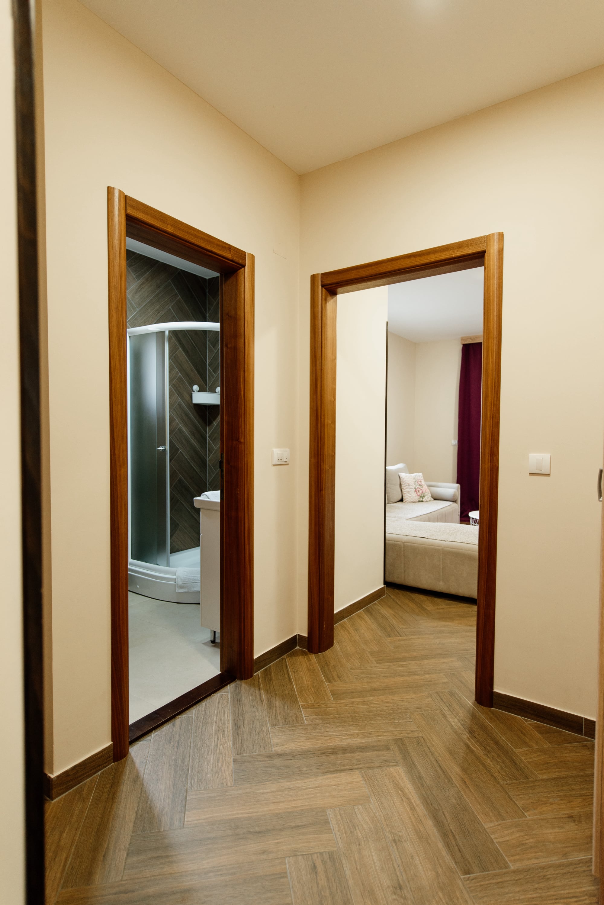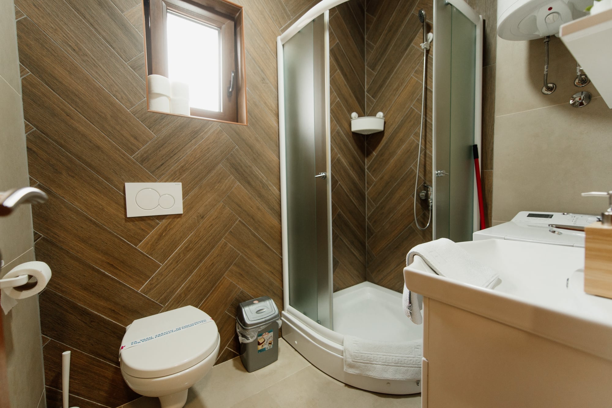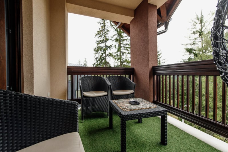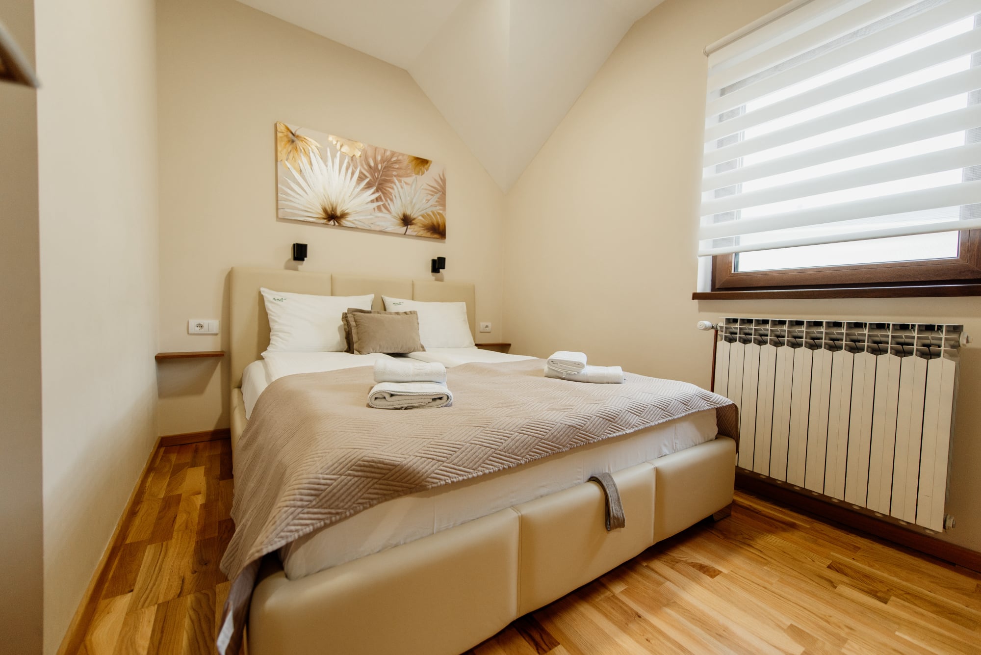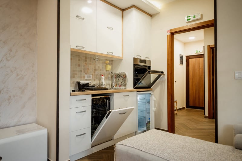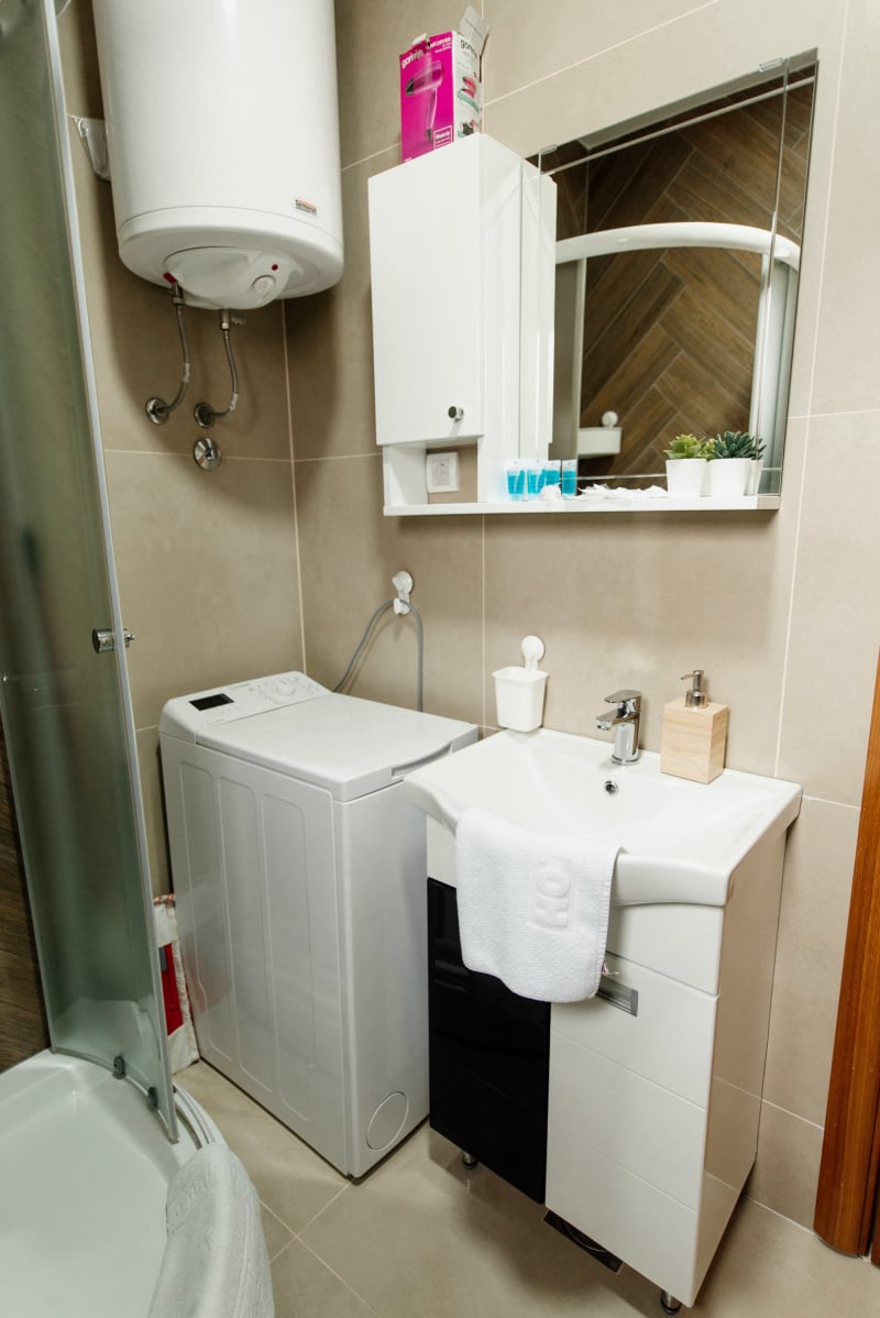APARTMAN 3 - Predsoblje, spavaća soba sa francuskim ležajem, dnevna soba sa ugaonom garniturom, kuhinja sa kompletnim posuđem, terasa sa stolom i stolicama, WC-toalet sa tuš kabinom. Svi apartmani imaju centralno i podno grejanje, LED TV u spavaćoj i dnevnoj sobi, WiFi sa PET pristupih tačaka, SEF za lične stvari. Površina 45 kvm + 8 kvm terasa.